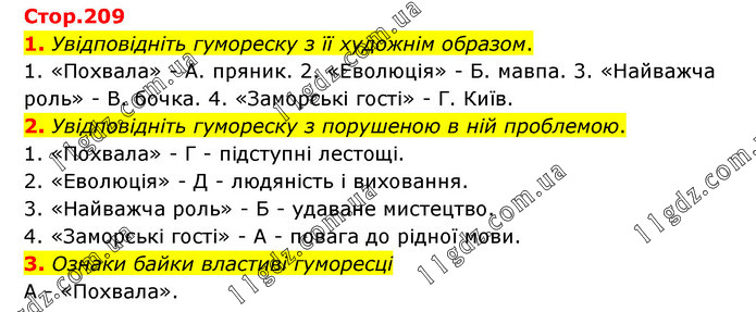 1. Увідповідніть гумореску з її художнім образом. 1. «Похвала» - А. пряник. 2. «Еволюція» - Б. мавпа. 3. «Найважча роль» - В. бочка. 4. «Заморські гості» - Г. Київ. 2. Увідповідніть гумореску з порушеною в ній проблемою. 1. «Похвала» - Г - підступні лестощі. 2. «Еволюція» - Д - людяність і виховання. 3. «Найважча роль» - Б - удаване мистецтво. 4. «Заморські гості» - А - повага до рідної мови. 3. Ознаки байки властиві гуморесці А - «Похвала».