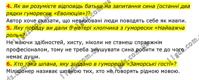 4. Як ви розумієте відповідь батька на запитання сина (останні два рядки гуморески «Еволюція»)? Автор хоче сказати, що невиховані люди поводять себе як мавпи. 5. Яку пораду ви дали б матері хлопчика з гуморески «Найважча роль»? Не маючи здібностей, хисту, ніколи не станеш справжнім професіоналом, тому не треба змушувати сина робити те до чого немає души. 6. Хто така шпана, яку згадано в гуморесці «Заморські гості»? Міліціонер називає шпаною тих, хто не говорять рідною мовою.