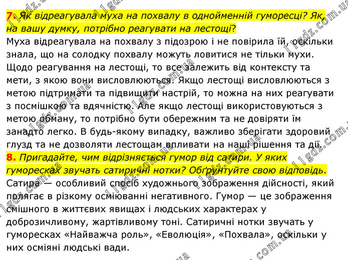 7. Як відреагувала муха на похвалу в однойменній гуморесці? Як, на вашу думку, потрібно реагувати на лестощі? Муха відреагувала на похвалу з підозрою і не повірила їй, оскільки знала, що на солодку похвалу можуть ловитися не тільки мухи. Щодо реагування на лестощі, то все залежить від контексту та мети, з якою вони висловлюються. Якщо лестощі висловлюються з метою підтримати та підвищити настрій, то можна на них реагувати з посмішкою та вдячністю. Але якщо лестощі використовуються з метою обману, то потрібно бути обережним та не довіряти їм занадто легко. В будь-якому випадку, важливо зберігати здоровий глузд та не дозволяти лестощам впливати на наші рішення та дії. 8. Пригадайте, чим відрізняється гумор від сатири. У яких гуморесках звучать сатиричні нотки? Обґрунтуйте свою відповідь. Сатира — особливий спосіб художнього зображення дійсності, який полягає в різкому осміюванні негативного. Гумор — це зображення смішного в життєвих явищах і людських характерах у доброзичливому, жартівливому тоні. Сатиричні нотки звучать у гуморесках «Найважча роль», «Еволюція», «Похвала», оскільки у них осміяні людські вади.