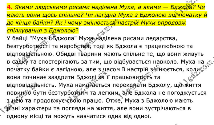 Якими людськими рисами наділена Муха, а якими — Бджола? Чи мають вони щось спільне? Чи лагідна Муха з Бджолою від початку й до кінця байки? Як і чому змінюється настрій Мухи впродовж спілкування з Бджолою? У байці "Муха і Бджола" Муха наділена рисами ледарства, безтурботності та неробства, тоді як Бджола є працелюбною та відповідальною. Обидві тварини мають спільне те, що вони живуть в садку та спостерігають за тим, що відбувається навколо. Муха на початку байки є лагідною, але з часом її настрій змінюється, коли вона починає заздрити Бджолі за її працьовитість та відповідальність. Муха намагається переконати Бджолу, що життя повинно бути безтурботним та легким, але Бджола не погоджується з нею та продовжує свою працю. Отже, Муха з Бджолою мають різні характери та погляди на життя, але вони зустрічаються в одному місці та можуть навчатися одна від одної.
