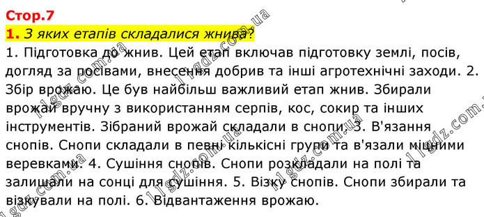 З яких етапів складалися жнива? 1. Підготовка до жнив. Цей етап включав підготовку землі, посів, догляд за посівами, внесення добрив та інші агротехнічні заходи. 2. Збір врожаю. Це був найбільш важливий етап жнив. Збирали врожай вручну з використанням серпів, кос, сокир та інших інструментів. Зібраний врожай складали в снопи. 3. В'язання снопів. Снопи складали в певні кількісні групи та в'язали міцними веревками. 4. Сушіння снопів. Снопи розкладали на полі та залишали на сонці для сушіння. 5. Візку снопів. Снопи збирали та візкували на полі. 6. Відвантаження врожаю.