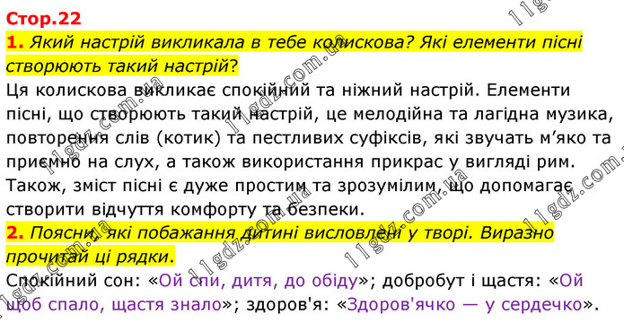 1. Який настрій викликала в тебе колискова? Які елементи пісні створюють такий настрій? Ця колискова викликає спокійний та ніжний настрій. Елементи пісні, що створюють такий настрій, це мелодійна та лагідна музика, повторення слів (котик) та пестливих суфіксів, які звучать м’яко та приємно на слух, а також використання прикрас у вигляді рим. Також, зміст пісні є дуже простим та зрозумілим, що допомагає створити відчуття комфорту та безпеки. 2. Поясни, які побажання дитині висловлені у творі. Виразно прочитай ці рядки. Спокійний сон: «Ой спи, дитя, до обіду»; добробут і щастя: «Ой щоб спало, щастя знало»; здоров'я: «Здоров'ячко — у сердечко».