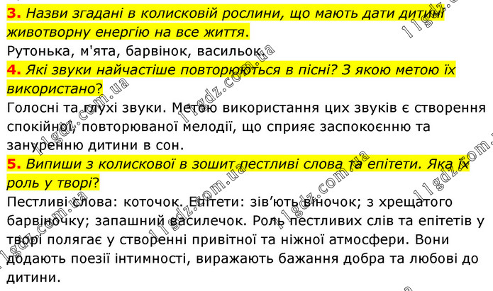 3. Назви згадані в колисковій рослини, що мають дати дитині животворну енергію на все життя. Рутонька, м'ята, барвінок, васильок. 4. Які звуки найчастіше повторюються в пісні? З якою метою їх використано? Голосні та глухі звуки. Метою використання цих звуків є створення спокійної, повторюваної мелодії, що сприяє заспокоєнню та зануренню дитини в сон. 5. Випиши з колискової в зошит пестливі слова та епітети. Яка їх роль у творі? Пестливі слова: коточок. Епітети: зів’ють віночок; з хрещатого барвіночку; запашний василечок. Роль пестливих слів та епітетів у творі полягає у створенні привітної та ніжної атмосфери. Вони додають поезії інтимності, виражають бажання добра та любові до дитини.