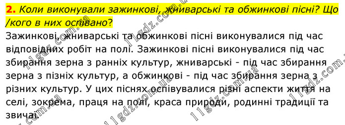 Коли виконували зажинкові, жниварські та обжинкові пісні? Що /кого в них оспівано? Зажинкові, жниварські та обжинкові пісні виконувалися під час відповідних робіт на полі. Зажинкові пісні виконувалися під час збирання зерна з ранніх культур, жниварські - під час збирання зерна з пізніх культур, а обжинкові - під час збирання зерна з різних культур. У цих піснях оспівувалися різні аспекти життя на селі, зокрема, праця на полі, краса природи, родинні традиції та звичаї.