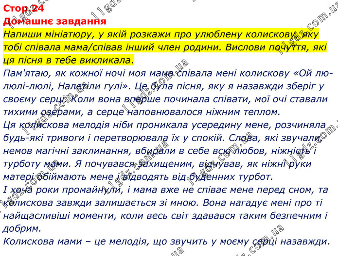 Домашнє завдання Напиши мініатюру, у якій розкажи про улюблену колискову, яку тобі співала мама/співав інший член родини. Вислови почуття, які ця пісня в тебе викликала. Пам'ятаю, як кожної ночі моя мама співала мені колискову «Ой лю-люлі-люлі, Налетіли гулі». Це була пісня, яку я назавжди зберіг у своєму серці. Коли вона вперше починала співати, мої очі ставали тихими озерами, а серце наповнювалося ніжним теплом. Ця колискова мелодія ніби проникала усередину мене, розчиняла будь-які тривоги і перетворювала їх у спокій. Слова, які звучали, немов магічні заклинання, вбирали в себе всю любов, ніжність і турботу мами. Я почувався захищеним, відчував, як ніжні руки матері обіймають мене і відводять від буденних турбот. І хоча роки промайнули, і мама вже не співає мене перед сном, та колискова завжди залишається зі мною. Вона нагадує мені про ті найщасливіші моменти, коли весь світ здавався таким безпечним і добрим. Колискова мами – це мелодія, що звучить у моєму серці назавжди.