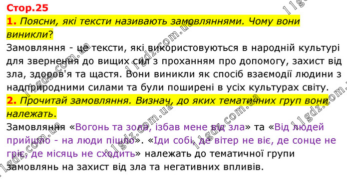 1. Поясни, які тексти називають замовляннями. Чому вони виникли? Замовляння - це тексти, які використовуються в народній культурі для звернення до вищих сил з проханням про допомогу, захист від зла, здоров'я та щастя. Вони виникли як спосіб взаємодії людини з надприродними силами та були поширені в усіх культурах світу. 2. Прочитай замовляння. Визнач, до яких тематичних груп вони належать. Замовляння «Вогонь та зола, ізбав мене від зла» та «Від людей прийшло - на люди пішло». «Іди собі, де вітер не віє, де сонце не гріє, де місяць не сходить» належать до тематичної групи замовлянь на захист від зла та негативних впливів.