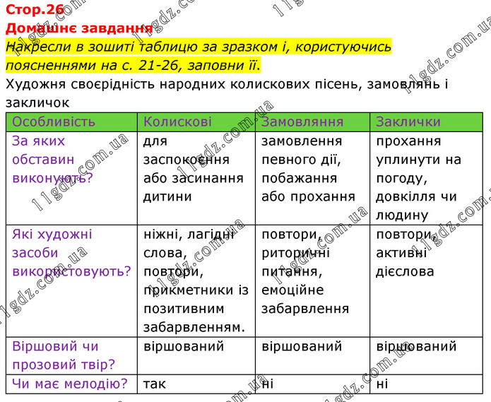 Домашнє завдання Накресли в зошиті таблицю за зразком і, користуючись поясненнями на с. 21-26, заповни її. Художня своєрідність народних колискових пісень, замовлянь і закличок
