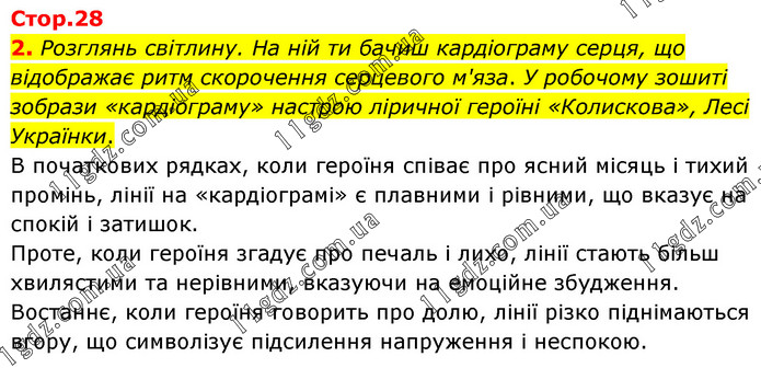 2. Розглянь світлину. На ній ти бачиш кардіограму серця, що відображає ритм скорочення серцевого м'яза. У робочому зошиті зобрази «кардіограму» настрою ліричної героїні «Колискова», Лесі Українки. В початкових рядках, коли героїня співає про ясний місяць і тихий промінь, лінії на «кардіограмі» є плавними і рівними, що вказує на спокій і затишок. Проте, коли героїня згадує про печаль і лихо, лінії стають більш хвилястими та нерівними, вказуючи на емоційне збудження. Востаннє, коли героїня говорить про долю, лінії різко піднімаються вгору, що символізує підсилення напруження і неспокою.