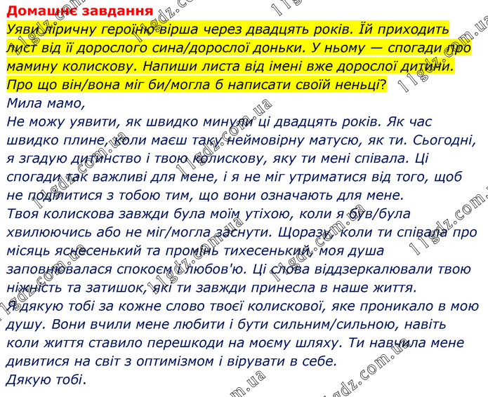 Домашнє завдання Уяви ліричну героїню вірша через двадцять років. Їй приходить лист від її дорослого сина/дорослої доньки. У ньому — спогади про мамину колискову. Напиши листа від імені вже дорослої дитини. Про що він/вона міг би/могла б написати своїй неньці? Мила мамо, Не можу уявити, як швидко минули ці двадцять років. Як час швидко плине, коли маєш таку неймовірну матусю, як ти. Сьогодні, я згадую дитинство і твою колискову, яку ти мені співала. Ці спогади так важливі для мене, і я не міг утриматися від того, щоб не поділитися з тобою тим, що вони означають для мене. Твоя колискова завжди була моїм утіхою, коли я був/була хвилюючись або не міг/могла заснути. Щоразу, коли ти співала про місяць яснесенький та промінь тихесенький, моя душа заповнювалася спокоєм і любов'ю. Ці слова віддзеркалювали твою ніжність та затишок, які ти завжди принесла в наше життя. Я дякую тобі за кожне слово твоєї колискової, яке проникало в мою душу. Вони вчили мене любити і бути сильним/сильною, навіть коли життя ставило перешкоди на моєму шляху. Ти навчила мене дивитися на світ з оптимізмом і вірувати в себе. Дякую тобі.