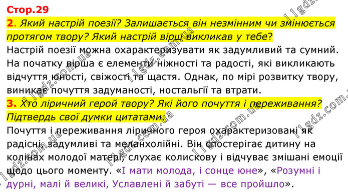 2. Який настрій поезії? Залишається він незмінним чи змінюється протягом твору? Який настрій вірш викликав у тебе? Настрій поезії можна охарактеризувати як задумливий та сумний. На початку вірша є елементи ніжності та радості, які викликають відчуття юності, свіжості та щастя. Однак, по мірі розвитку твору, виникає почуття задуманості, ностальгії та втрати. 3. Хто ліричний герой твору? Які його почуття і переживання? Підтвердь свої думки цитатами. Почуття і переживання ліричного героя охарактеризовані як радісні, задумливі та меланхолійні. Він спостерігає дитину на колінах молодої матері, слухає колискову і відчуває змішані емоції щодо цього моменту. «І мати молода, і сонце юне», «Розумні і дурні, малі й великі, Уславлені й забуті — все пройшло».