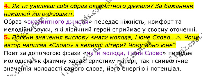 4. Як ти уявляєш собі образ оксамитного джмеля? За бажанням намалюй його в зошиті. Образ «оксамитного джмеля» передає ніжність, комфорт та мелодійні звуки, які ліричний герой сприймає у своєму оточенні. 5. Поясни значення вислову «мати молода, і юне Слово...». Чому автор написав «Слово» з великої літери? Чому воно юне? Поет за допомогою фрази «мати молода, і юне Слово» передає молодість як фізичну характеристику матері, так і символічне значення молодості самого слова, його енергію і потенціал.