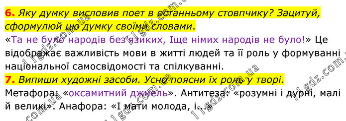 6. Яку думку висловив поет в останньому стовпчику? Зацитуй, сформулюй цю думку своїми словами. «Та не було народів без’язиких, Іще німих народів не було!» Це відображає важливість мови в житті людей та її роль у формуванні національної самосвідомості та спілкуванні. 7. Випиши художні засоби. Усно поясни їх роль у творі. Метафора: «оксамитний джмель». Антитеза: «розумні і дурні, малі й великі». Анафора: «І мати молода, і...»