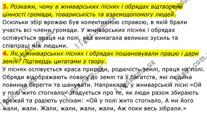 3. Розкажи, чому в жниварських піснях і обрядах відтворено цінності громади, товариськість та взаємодопомогу людей. Оскільки збір врожаю був колективною справою, в якій брали участь всі члени громади. У жниварських піснях і обрядах оспівується праця на полі, яка вимагала великих зусиль та співпраці між людьми. 4. Як у жниварських піснях і обрядах пошановували працю і дари землі? Підтвердь цитатами з твору. У піснях оспівується краса природи, родючість землі, праця на полі. Обряди відображають повагу до землі та її багатств, які людина повинна берегти та шанувати. Наприклад, у жниварській пісні «Ой у полі жито стогнало» згадується про те, як люди разом збирають врожай та радіють успіхам: «Ой у полі жито стогнало, А ми його жали, жали. Жали, жали, жали, жали, Аж поки весь зібрали.»