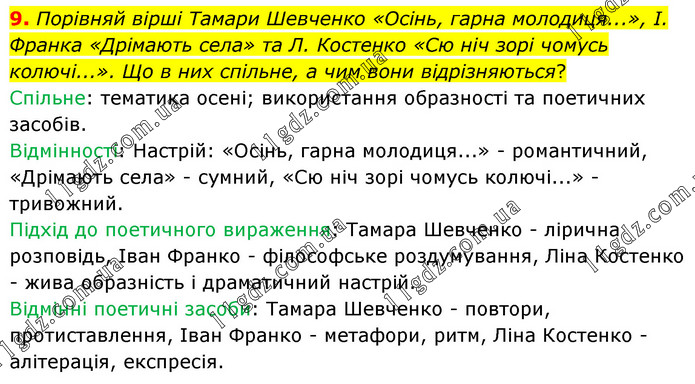 9. Порівняй вірші Тамари Шевченко «Осінь, гарна молодиця...», І. Франка «Дрімають села» та Л. Костенко «Сю ніч зорі чомусь колючі...». Що в них спільне, а чим вони відрізняються? Спільне: тематика осені; використання образності та поетичних засобів. Відмінності: Настрій: «Осінь, гарна молодиця...» - романтичний, «Дрімають села» - сумний, «Сю ніч зорі чомусь колючі...» - тривожний. Підхід до поетичного вираження: Тамара Шевченко - лірична розповідь, Іван Франко - філософське роздумування, Ліна Костенко - жива образність і драматичний настрій. Відмінні поетичні засоби: Тамара Шевченко - повтори, протиставлення, Іван Франко - метафори, ритм, Ліна Костенко - алітерація, експресія.