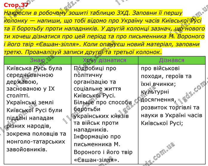 Накресли в робочому зошиті таблицю ЗХД. Заповни її першу колонку — напиши, що тобі відомо про Україну часів Київської Русі та її боротьбу проти нападників. У другій колонці зазнач, що нового ти хочеш дізнатися про цей період та про письменника М. Вороного і його твір «Євшан-зілля». Коли опануєш новий матеріал, заповни третю. Проаналізуй записи другої та третьої колонок.