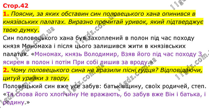 1. Поясни, за яких обставин син половецького хана опинився в князівських палатах. Виразно прочитай уривок, який підтверджує твою думку. Син половецького хана був захоплений в полон під час походу князя Мономаха і після цього залишився жити в князівських палатах. «Мономах, князь Володимир, Взяв його під час походу З ясирем в полон і потім При собі лишив за вроду.» 2. Чому половецького сина не вразили пісні гудця? Відповідаючи, цитуй уривки з твору. Половецький син вже усе забув: батьківщину, своїх родичей, степ. «Та слова його хлопчину Не вражають, бо забув вже Він і батька, і родину.»
