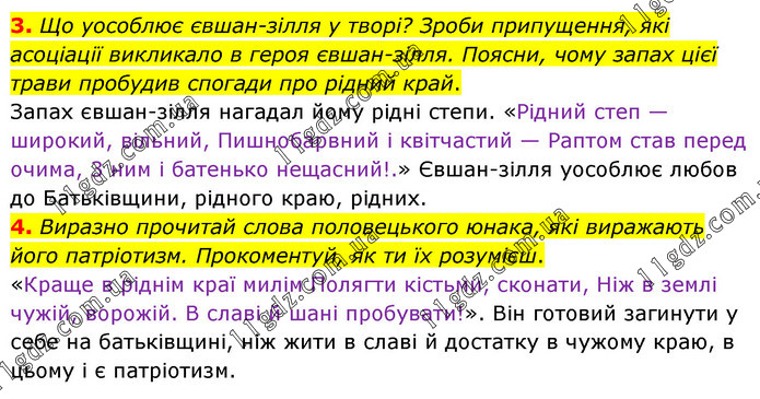 3. Що уособлює євшан-зілля у творі? Зроби припущення, які асоціації викликало в героя євшан-зілля. Поясни, чому запах цієї трави пробудив спогади про рідний край. Запах євшан-зілля нагадал йому рідні степи. «Рідний степ — широкий, вільний, Пишнобарвний і квітчастий — Раптом став перед очима, 3 ним і батенько нещасний!.» Євшан-зілля уособлює любов до Батьківщини, рідного краю, рідних. 4. Виразно прочитай слова половецького юнака, які виражають його патріотизм. Прокоментуй, як ти їх розумієш. «Краще в ріднім краї милім Полягти кістьми, сконати, Ніж в землі чужій, ворожій. В славі й шані пробувати!». Він готовий загинути у себе на батьківщині, ніж жити в славі й достатку в чужому краю, в цьому і є патріотизм.