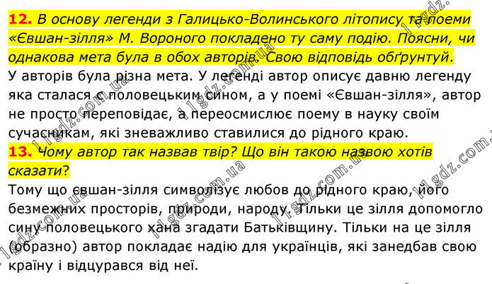 12. В основу легенди з Галицько-Волинського літопису та поеми «Євшан-зілля» М. Вороного покладено ту саму подію. Поясни, чи однакова мета була в обох авторів. Свою відповідь обґрунтуй. У авторів була різна мета. У легенді автор описує давню легенду яка сталася с половецьким сином, а у поемі «Євшан-зілля», автор не просто переповідає, а переосмислює поему в науку своїм сучасникам, які зневажливо ставилися до рідного краю. 13. Чому автор так назвав твір? Що він такою назвою хотів сказати? Тому що євшан-зілля символізує любов до рідного краю, його безмежних просторів, природи, народу. Тільки це зілля допомогло сину половецького хана згадати Батьківщину. Тільки на це зілля (образно) автор покладає надію для українців, які занедбав свою країну і відцурався від неї.