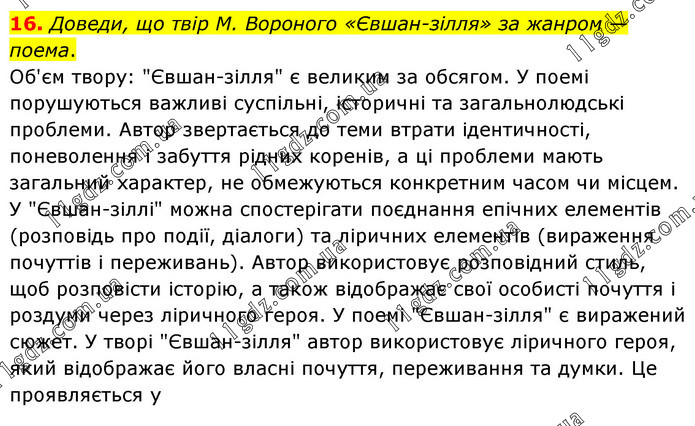 Доведи, що твір М. Вороного «Євшан-зілля» за жанром — поема. Об'єм твору: "Євшан-зілля" є великим за обсягом. У поемі порушуються важливі суспільні, історичні та загальнолюдські проблеми. Автор звертається до теми втрати ідентичності, поневолення і забуття рідних коренів, а ці проблеми мають загальний характер, не обмежуються конкретним часом чи місцем. У "Євшан-зіллі" можна спостерігати поєднання епічних елементів (розповідь про події, діалоги) та ліричних елементів (вираження почуттів і переживань). Автор використовує розповідний стиль, щоб розповісти історію, а також відображає свої особисті почуття і роздуми через ліричного героя. У поемі "Євшан-зілля" є виражений сюжет. У творі "Євшан-зілля" автор використовує ліричного героя, який відображає його власні почуття, переживання та думки. Це проявляється у