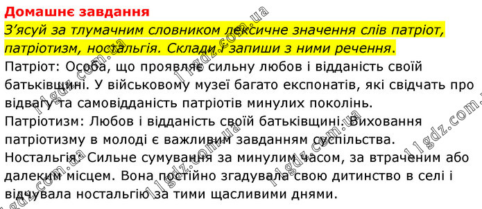 Домашнє завдання З’ясуй за тлумачним словником лексичне значення слів патріот, патріотизм, ностальгія. Склади і запиши з ними речення. Патріот: Особа, що проявляє сильну любов і відданість своїй батьківщині. У військовому музеї багато експонатів, які свідчать про відвагу та самовідданість патріотів минулих поколінь. Патріотизм: Любов і відданість своїй батьківщині. Виховання патріотизму в молоді є важливим завданням суспільства. Ностальгія: Сильне сумування за минулим часом, за втраченим або далеким місцем. Вона постійно згадувала свою дитинство в селі і відчувала ностальгію за тими щасливими днями.