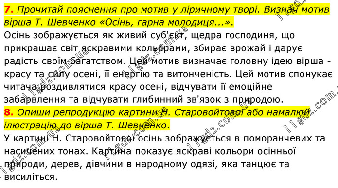 7. Прочитай пояснення про мотив у ліричному творі. Визнач мотив вірша Т. Шевченко «Осінь, гарна молодиця...». Осінь зображується як живий суб'єкт, щедра господиня, що прикрашає світ яскравими кольорами, збирає врожай і дарує радість своїм багатством. Цей мотив визначає головну ідею вірша - красу та силу осені, її енергію та витонченість. Цей мотив спонукає читача роздивлятися красу осені, відчувати її емоційне забарвлення та відчувати глибинний зв'язок з природою. 8. Опиши репродукцію картини Н. Старовойтової або намалюй ілюстрацію до вірша Т. Шевченко. У картині Н. Старовойтової осінь зображується в поморанчевих та насичених тонах. Картина показує яскраві кольори осінньої природи, дерев, дівчини в народному одязі, яка танцює та висиліться.