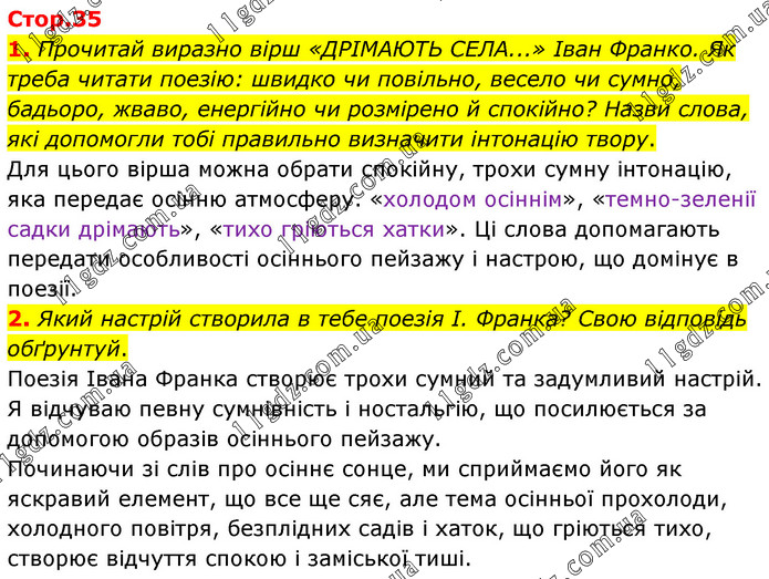 1. Прочитай виразно вірш «ДРІМАЮТЬ СЕЛА...» Іван Франко. Як треба читати поезію: швидко чи повільно, весело чи сумно, бадьоро, жваво, енергійно чи розмірено й спокійно? Назви слова, які допомогли тобі правильно визначити інтонацію твору. Для цього вірша можна обрати спокійну, трохи сумну інтонацію, яка передає осінню атмосферу. «холодом осіннім», «темно-зеленії садки дрімають», «тихо гріються хатки». Ці слова допомагають передати особливості осіннього пейзажу і настрою, що домінує в поезії. 2. Який настрій створила в тебе поезія І. Франка? Свою відповідь обґрунтуй. Поезія Івана Франка створює трохи сумний та задумливий настрій. Я відчуваю певну сумнівність і ностальгію, що посилюється за допомогою образів осіннього пейзажу. Починаючи зі слів про осіннє сонце, ми сприймаємо його як яскравий елемент, що все ще сяє, але тема осінньої прохолоди, холодного повітря, безплідних садів і хаток, що гріються тихо, створює відчуття спокою і заміської тиші.
