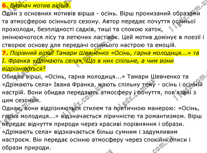 6. Визнач мотив вірша. Один з основних мотивів вірша - осінь. Вірш пронизаний образами та атмосферою осіннього сезону. Автор передає почуття осінньої прохолоди, безплідності садків, тиші та спокою хаток, змінюючогося лісу та летючих ластівок. Цей мотив домінує в поезії і створює основу для передачі осіннього настрою та емоцій. 7. Порівняй вірші Тамари Шевченко «Осінь, гарна молодиця...» та І. Франка «Дрімають села». Що в них спільне, а чим вони відрізняються? Обидва вірші, «Осінь, гарна молодиця...» Тамари Шевченко та «Дрімають села» Івана Франка, мають спільну тему - осінь і осінній настрій. Вони обидва передають атмосферу і почуття, пов'язані з цим сезоном. Однак, вони відрізняються стилем та поетичною манерою: «Осінь, гарна молодиця...» відзначається ліричністю та романтизмом. Вірш передає відчуття природи через красиві порівняння і образи. «Дрімають села» відзначається більш сумним і задумливим настроєм. Він передає осінню атмосферу через спокійні описи і образи природи.