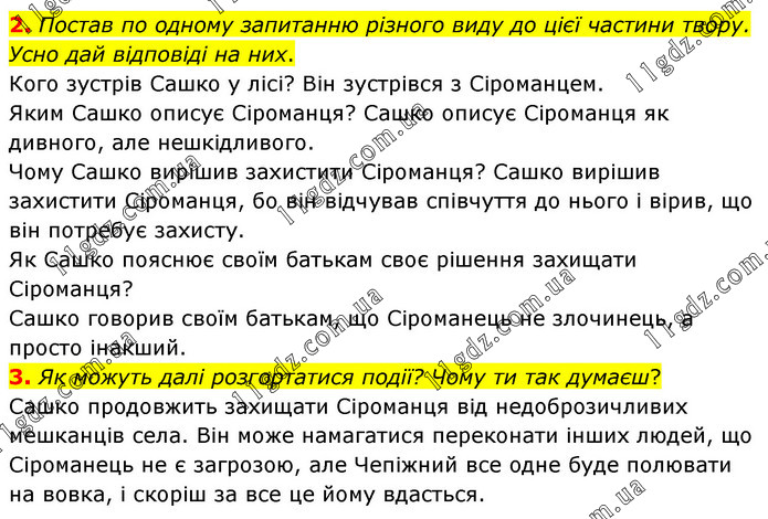 2. Постав по одному запитанню різного виду до цієї частини твору. Усно дай відповіді на них. Кого зустрів Сашко у лісі? Він зустрівся з Сіроманцем. Яким Сашко описує Сіроманця? Сашко описує Сіроманця як дивного, але нешкідливого. Чому Сашко вирішив захистити Сіроманця? Сашко вирішив захистити Сіроманця, бо він відчував співчуття до нього і вірив, що він потребує захисту. Як Сашко пояснює своїм батькам своє рішення захищати Сіроманця? Сашко говорив своїм батькам, що Сіроманець не злочинець, а просто інакший. 3. Як можуть далі розгортатися події? Чому ти так думаєш? Сашко продовжить захищати Сіроманця від недоброзичливих мешканців села. Він може намагатися переконати інших людей, що Сіроманець не є загрозою, але Чепіжний все одне буде полювати на вовка, і скоріш за все це йому вдасться.