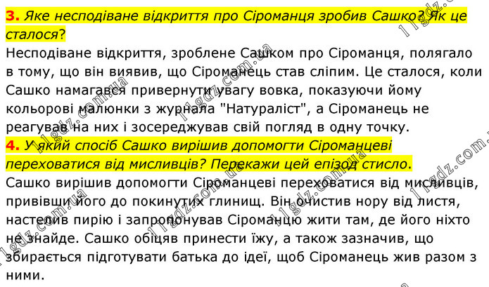 3. Яке несподіване відкриття про Сіроманця зробив Сашко? Як це сталося? Несподіване відкриття, зроблене Сашком про Сіроманця, полягало в тому, що він виявив, що Сіроманець став сліпим. Це сталося, коли Сашко намагався привернути увагу вовка, показуючи йому кольорові малюнки з журнала "Натураліст", а Сіроманець не реагував на них і зосереджував свій погляд в одну точку. 4. У який спосіб Сашко вирішив допомогти Сіроманцеві переховатися від мисливців? Перекажи цей епізод стисло. Сашко вирішив допомогти Сіроманцеві переховатися від мисливців, привівши його до покинутих глинищ. Він очистив нору від листя, настелив пирію і запропонував Сіроманцю жити там, де його ніхто не знайде. Сашко обіцяв принести їжу, а також зазначив, що збирається підготувати батька до ідеї, щоб Сіроманець жив разом з ними.