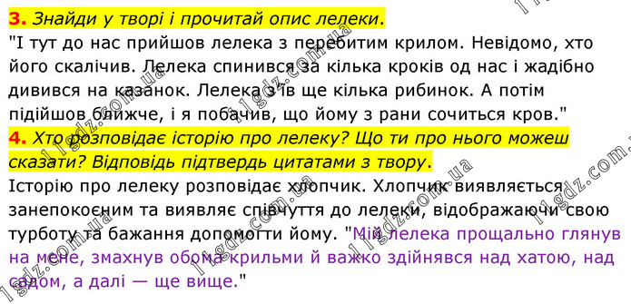 3. Знайди у творі і прочитай опис лелеки. "І тут до нас прийшов лелека з перебитим крилом. Невідомо, хто його скалічив. Лелека спинився за кілька кроків од нас і жадібно дивився на казанок. Лелека з’їв ще кілька рибинок. А потім підійшов ближче, і я побачив, що йому з рани сочиться кров." 4. Хто розповідає історію про лелеку? Що ти про нього можеш сказати? Відповідь підтвердь цитатами з твору. Історію про лелеку розповідає хлопчик. Хлопчик виявляється занепокоєним та виявляє співчуття до лелеки, відображаючи свою турботу та бажання допомогти йому. "Мій лелека прощально глянув на мене, змахнув обома крильми й важко здійнявся над хатою, над садом, а далі — ще вище."
