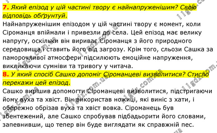 7. Який епізод у цій частині твору є найнапруженішим? Свою відповідь обґрунтуй. Найнапруженішим епізодом у цій частині твору є момент, коли Сіроманця впіймали і привезли до села. Цей епізод має велику напругу, оскільки він вириває Сіроманця з його природного середовища і ставить його під загрозу. Крім того, сльози Сашка за паморочливої атмосфери підсилюють емоційне напруження, викликаючи сумніви та тривогу у читача. 8. У який спосіб Сашко допоміг Сіроманцеві визволитися? Стисло перекажи цей епізод. Сашко вирішив допомогти Сіроманцеві визволитися, підстригаючи йому вуха та хвіст. Він використав ножиці, які виніс з хати, і обережно обрізав вуха та хвіст вовка. Сіроманець був збентежений, але Сашко спробував підбадьорити його словами, запевнивши, що тепер він буде виглядати як справжній пес.