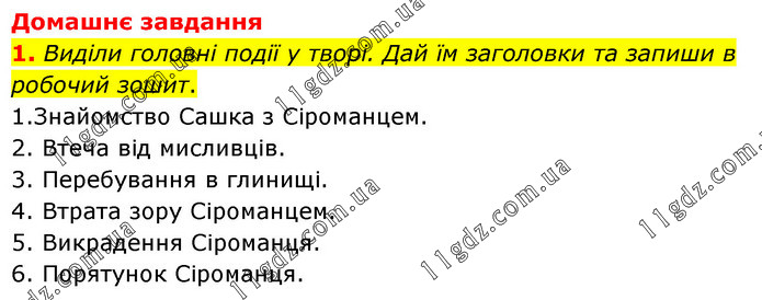 Домашнє завдання 1. Виділи головні події у творі. Дай їм заголовки та запиши в робочий зошит. 1.Знайомство Сашка з Сіроманцем. 2. Втеча від мисливців. 3. Перебування в глинищі. 4. Втрата зору Сіроманцем. 5. Викрадення Сіроманця. 6. Порятунок Сіроманця.