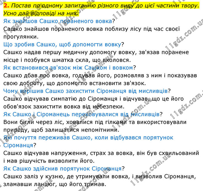 2. Постав по одному запитанню різного виду до цієї частини твору. Усно дай відповіді на них. Як знайшов Сашко пораненого вовка? Сашко знайшов пораненого вовка поблизу лісу під час своєї прогулянки. Що зробив Сашко, щоб допомогти вовку? Сашко надав першу медичну допомогу вовку, зв'язав поранене місце і позбувся шматка скла, що вколовся. Як встановився зв'язок між Сашком і вовком? Сашко дбав про вовка, годував його, розмовляв з ним і показував свою доброту, що допомогло встановити зв'язок. Чому вирішив Сашко захистити Сіроманця від мисливців? Сашко відчував симпатію до Сіроманця і відчував, що це його обов'язок захистити вовка від небезпеки. Як Сашко і Сіроманець переховувалися від мисливців? Вони бігли через ліс, ховалися під гілками та використовували природу, щоб залишатися непомітними. Які почуття переживав Сашко, коли відбувався порятунок Сіроманця? Сашко відчував напруження, страх за вовка, він був схвильований і мав рішучість визволити його. Як Сашко здійснив порятунок Сіроманця? Сашко заліз у кузню, де утримували вовка, і визволив Сіроманця, зламавши ланцюг, що його тримав.
