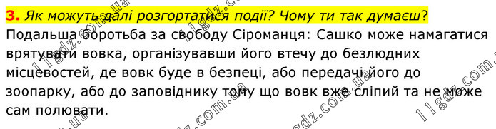 Як можуть далі розгортатися події? Чому ти так думаєш? Подальша боротьба за свободу Сіроманця: Сашко може намагатися врятувати вовка, організувавши його втечу до безлюдних місцевостей, де вовк буде в безпеці, або передачі його до зоопарку, або до заповіднику тому що вовк вже сліпий та не може сам полювати.