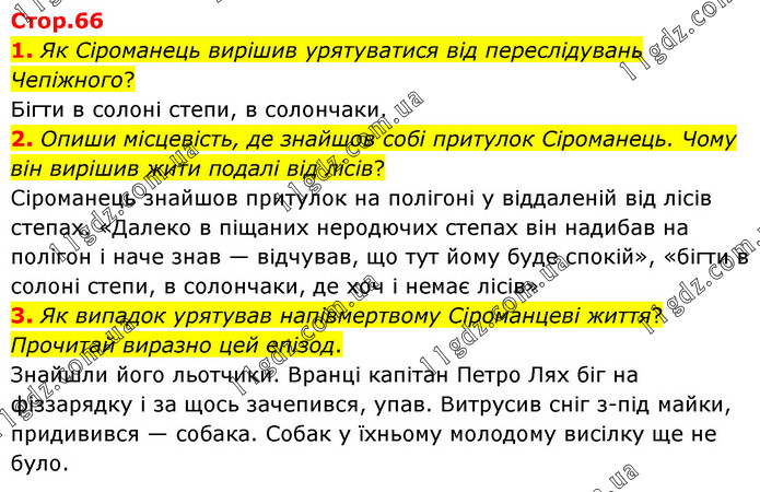 1. Як Сіроманець вирішив урятуватися від переслідувань Чепіжного? Бігти в солоні степи, в солончаки. 2. Опиши місцевість, де знайшов собі притулок Сіроманець. Чому він вирішив жити подалі від лісів? Сіроманець знайшов притулок на полігоні у віддаленій від лісів степах. «Далеко в піщаних неродючих степах він надибав на полігон і наче знав — відчував, що тут йому буде спокій», «бігти в солоні степи, в солончаки, де хоч і немає лісів» 3. Як випадок урятував напівмертвому Сіроманцеві життя? Прочитай виразно цей епізод. Знайшли його льотчики. Вранці капітан Петро Лях біг на фіззарядку і за щось зачепився, упав. Витрусив сніг з-під майки, придивився — собака. Собак у їхньому молодому висілку ще не було.