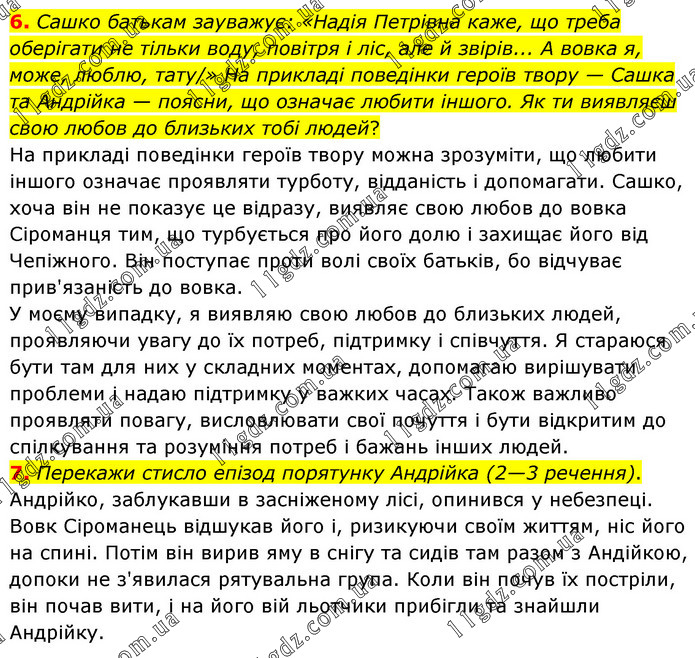 6. Сашко батькам зауважує: «Надія Петрівна каже, що треба оберігати не тільки воду, повітря і ліс, але й звірів... А вовка я, може, люблю, тату/» На прикладі поведінки героїв твору — Сашка та Андрійка — поясни, що означає любити іншого. Як ти виявляєш свою любов до близьких тобі людей? На прикладі поведінки героїв твору можна зрозуміти, що любити іншого означає проявляти турботу, відданість і допомагати. Сашко, хоча він не показує це відразу, виявляє свою любов до вовка Сіроманця тим, що турбується про його долю і захищає його від Чепіжного. Він поступає проти волі своїх батьків, бо відчуває прив'язаність до вовка. У моєму випадку, я виявляю свою любов до близьких людей, проявляючи увагу до їх потреб, підтримку і співчуття. Я стараюся бути там для них у складних моментах, допомагаю вирішувати проблеми і надаю підтримку у важких часах. Також важливо проявляти повагу, висловлювати свої почуття і бути відкритим до спілкування та розуміння потреб і бажань інших людей. 7. Перекажи стисло епізод порятунку Андрійка (2—3 речення). Андрійко, заблукавши в засніженому лісі, опинився у небезпеці. Вовк Сіроманець відшукав його і, ризикуючи своїм життям, ніс його на спині. Потім він вирив яму в снігу та сидів там разом з Андійкою, допоки не з'явилася рятувальна група. Коли він почув їх постріли, він почав вити, і на його вій льотчики прибігли та знайшли Андрійку.