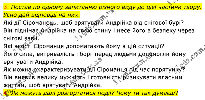 3. Постав по одному запитанню різного виду до цієї частини твору. Усно дай відповіді на них. Які дії Сіроманець, щоб врятувати Андрійка від снігової бурі? Він піднімає Андрійка на свою спину і несе його в безпеку через снігові завії. Які якості Сіроманця допомагають йому в цій ситуації? Його сила, витривалість і борг перед людьми допомогли йому врятувати Андрійка. Як можна охарактеризувати дії Сіроманця під час порятунку? Він виявив велику мужність і готовність ризикувати власним життям, щоб врятувати Андрійка. 4. Як можуть далі розгортатися події? Чому ти так думаєш?