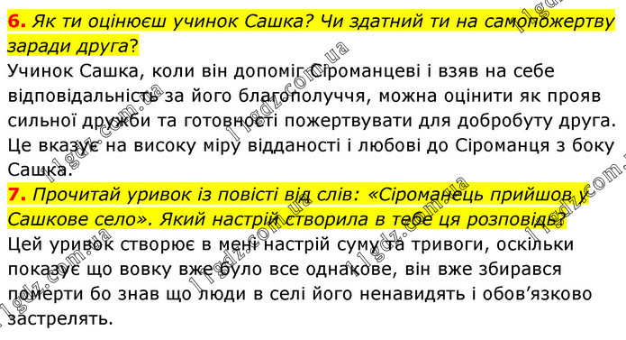 6. Як ти оцінюєш учинок Сашка? Чи здатний ти на самопожертву заради друга? Учинок Сашка, коли він допоміг Сіроманцеві і взяв на себе відповідальність за його благополуччя, можна оцінити як прояв сильної дружби та готовності пожертвувати для добробуту друга. Це вказує на високу міру відданості і любові до Сіроманця з боку Сашка. 7. Прочитай уривок із повісті від слів: «Сіроманець прийшов у Сашкове село». Який настрій створила в тебе ця розповідь? Цей уривок створює в мені настрій суму та тривоги, оскільки показує що вовку вже було все однакове, він вже збирався померти бо знав що люди в селі його ненавидять і обов’язково застрелять.