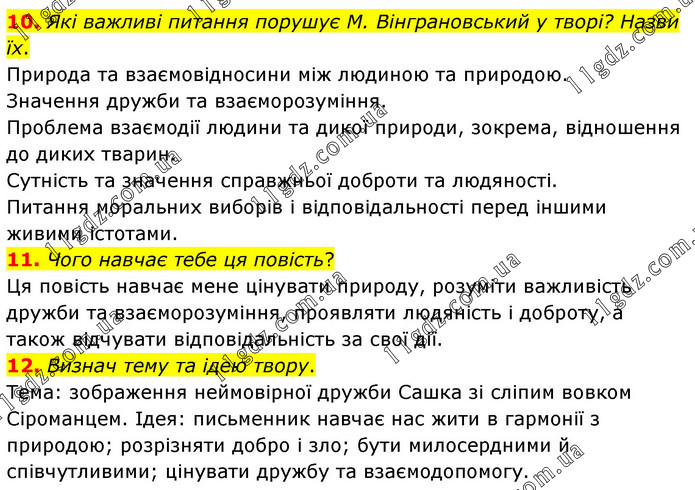 10. Які важливі питання порушує М. Вінграновський у творі? Назви їх. Природа та взаємовідносини між людиною та природою. Значення дружби та взаєморозуміння. Проблема взаємодії людини та дикої природи, зокрема, відношення до диких тварин. Сутність та значення справжньої доброти та людяності. Питання моральних виборів і відповідальності перед іншими живими істотами. 11. Чого навчає тебе ця повість? Ця повість навчає мене цінувати природу, розуміти важливість дружби та взаєморозуміння, проявляти людяність і доброту, а також відчувати відповідальність за свої дії. 12. Визнач тему та ідею твору. Тема: зображення неймовірної дружби Сашка зі сліпим вовком Сіроманцем. Ідея: письменник навчає нас жити в гармонії з природою; розрізняти добро і зло; бути милосердними й співчутливими; цінувати дружбу та взаємодопомогу.