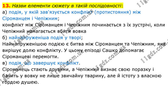 13. Назви елементи сюжету в такій послідовності: а) подія, у якій зав'язується конфлікт (протистояння) між Сіроманцем і Чепіжним; конфлікт між Сіроманцем і Чепіжним починається з їх зустрічі, коли Чепіжний намагається вбити вовка б) найнапруженіша подія у творі; Найнапруженішою подією є битва між Сіроманцем та Чепіжним, яка вирішує долю конфлікту. У цьому епізоді Сашко допомагає Сіроманцеві перемогти. в) подія, що завершує конфлікт. Сіроманець стають друзями, а Чепіжний визнає свою поразку і бачить у вовку не лише звичайну тварину, але й істоту з власною гордою душею.