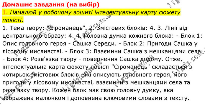 Домашнє завдання (на вибір) 1. Намалюй у робочому зошиті інтелектуальну карту сюжету повісті. 1. Тема твору: "Сіроманець". 2. Змістових блоків: 4. 3. Лінії від центрального образу: 4. 4. Головна думка кожного блока: - Блок 1: Опис головного героя - Сашка Середи. - Блок 2: Пригоди Сашка у лісовому мисливстві. - Блок 3: Взаємини Сашка з мешканцями села. - Блок 4: Розв'язка твору - повернення Сашка додому. Отже, інтелектуальна карта сюжету повісті "Сіроманець" складається з чотирьох змістових блоків, які описують головного героя, його пригоди у лісовому мисливстві, взаємини з мешканцями села та розв'язку твору. Кожен блок має свою головну думку, яка зображена малюнком і доповнена ключовими словами з тексту.