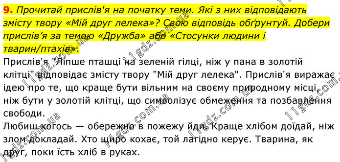 Прочитай прислів'я на початку теми. Які з них відповідають змісту твору «Мій друг лелека»? Свою відповідь обґрунтуй. Добери прислів’я за темою «Дружба» або «Стосунки людини і тварин/птахів». Прислів'я "Ліпше пташці на зеленій гілці, ніж у пана в золотій клітці" відповідає змісту твору "Мій друг лелека". Прислів'я виражає ідею про те, що краще бути вільним на своєму природному місці, ніж бути у золотій клітці, що символізує обмеження та позбавлення свободи. Любиш когось — обережно в пожежу йди. Краще хлібом доїдай, ніж злом докладай. Хто щиро кохає, той лагідно керує. Тварина, як друг, поки їсть хліб в руках.