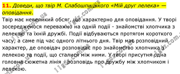 Доведи, що твір М. Слабошпицького «Мій друг лелека» — оповідання. Твір має невеликий обсяг, що характерно для оповідання. У творі зосередженося переважно на одній події - знайомстві хлопчика з лелекою та їхній дружбі. Події відбуваються протягом короткого часу, а саме під час одного літнього дня. Твір має розповідний характер, де оповідач розповідає про знайомство хлопчика з лелекою та події, що сталися між ними. У творі присутня одна головна сюжетна лінія - розповідь про дружбу між хлопчиком і лелекою.