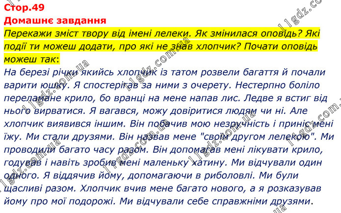 Домашнє завдання Перекажи зміст твору від імені лелеки. Як змінилася оповідь? Які події ти можеш додати, про які не знав хлопчик? Почати оповідь можеш так: На березі річки якийсь хлопчик із татом розвели багаття й почали варити юшку. Я спостерігав за ними з очерету. Нестерпно боліло переламане крило, бо вранці на мене напав лис. Ледве я встиг від нього вирватися. Я вагався, можу довіритися людям чи ні. Але хлопчик виявився іншим. Він побачив мою незручність і приніс мені їжу. Ми стали друзями. Він назвав мене "своїм другом лелекою". Ми проводили багато часу разом. Він допомагав мені лікувати крило, годував і навіть зробив мені маленьку хатину. Ми відчували один одного. Я віддячив йому, допомагаючи в риболовлі. Ми були щасливі разом. Хлопчик вчив мене багато нового, а я розказував йому про мої подорожі. Ми відчували себе справжніми друзями.