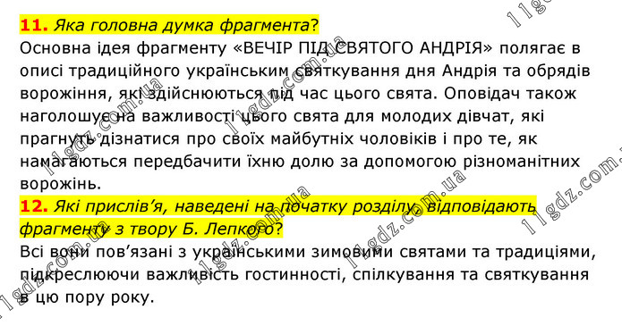 11. Яка головна думка фрагмента? Основна ідея фрагменту «ВЕЧІР ПІД СВЯТОГО АНДРІЯ» полягає в описі традиційного українським святкування дня Андрія та обрядів ворожіння, які здійснюються під час цього свята. Оповідач також наголошує на важливості цього свята для молодих дівчат, які прагнуть дізнатися про своїх майбутніх чоловіків і про те, як намагаються передбачити їхню долю за допомогою різноманітних ворожінь. 12. Які прислів’я, наведені на початку розділу, відповідають фрагменту з твору Б. Лепкого? Всі вони пов’язані з українськими зимовими святами та традиціями, підкреслюючи важливість гостинності, спілкування та святкування в цю пору року.