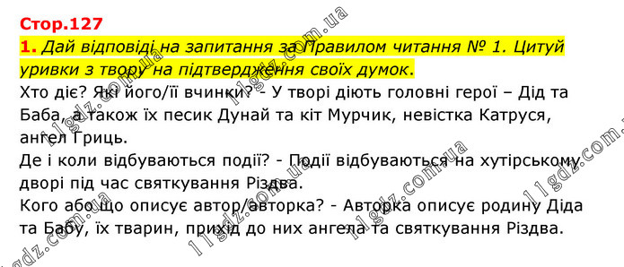 1. Дай відповіді на запитання за Правилом читання № 1. Цитуй уривки з твору на підтвердження своїх думок. Хто діє? Які його/її вчинки? - У творі діють головні герої – Дід та Баба, а також їх песик Дунай та кіт Мурчик, невістка Катруся, ангел Гриць. Де і коли відбуваються події? - Подiї вiдбуваються на хутiрському дворi пiд час святкування Рiздва. Кого або що описує автор/авторка? - Авторка описує родину Діда та Бабу, їх тварин, прихід до них ангела та святкування Різдва.
