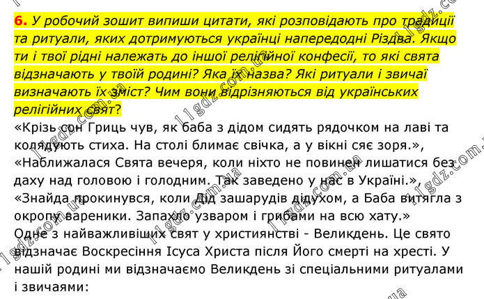 У робочий зошит випиши цитати, які розповідають про традиції та ритуали, яких дотримуються українці напередодні Різдва. Якщо ти і твої рідні належать до іншої релігійної конфесії, то які свята відзначають у твоїй родині? Яка їх назва? Які ритуали і звичаї визначають їх зміст? Чим вони відрізняються від українських релігійних свят? «Крізь сон Гриць чув, як баба з дідом сидять рядочком на лаві та колядують стиха. На столі блимає свічка, а у вікні сяє зоря.», «Наближалася Свята вечеря, коли ніхто не повинен лишатися без даху над головою і голодним. Так заведено у нас в Україні.», «Знайда прокинувся, коли Дід зашарудів дідухом, а Баба витягла з окропу вареники. Запахло узваром і грибами на всю хату.» Одне з найважливіших свят у християнстві - Великдень. Це свято відзначає Воскресіння Ісуса Христа після Його смерті на хресті. У нашій родині ми відзначаємо Великдень зі спеціальними ритуалами і звичаями: