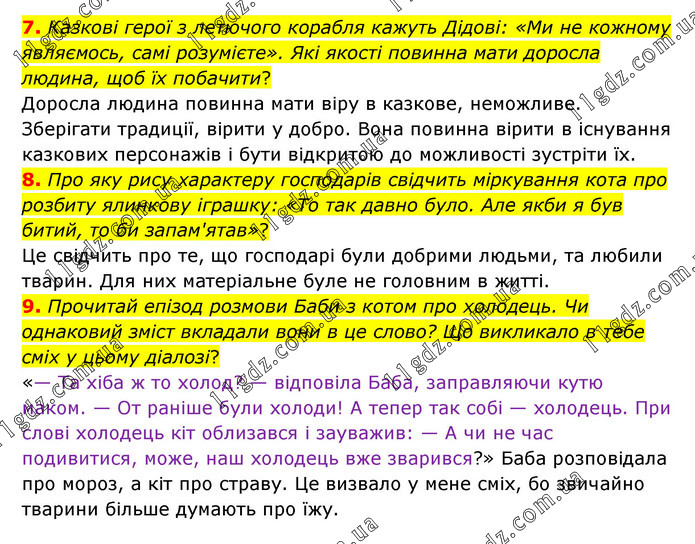 7. Казкові герої з летючого корабля кажуть Дідові: «Ми не кожному являємось, самі розумієте». Які якості повинна мати доросла людина, щоб їх побачити? Доросла людина повинна мати віру в казкове, неможливе. Зберігати традиції, вірити у добро. Вона повинна вірити в існування казкових персонажів і бути відкритою до можливості зустріти їх. 8. Про яку рису характеру господарів свідчить міркування кота про розбиту ялинкову іграшку: «То так давно було. Але якби я був битий, то би запам'ятав»? Це свідчить про те, що господарі були добрими людьми, та любили тварин. Для них матеріальне буле не головним в житті. 9. Прочитай епізод розмови Баби з котом про холодець. Чи однаковий зміст вкладали вони в це слово? Що викликало в тебе сміх у цьому діалозі? «— Та хіба ж то холод? — відповіла Баба, заправляючи кутю маком. — От раніше були холоди! А тепер так собі — холодець. При слові холодець кіт облизався і зауважив: — А чи не час подивитися, може, наш холодець вже зварився?» Баба розповідала про мороз, а кіт про страву. Це визвало у мене сміх, бо звичайно тварини більше думають про їжу.