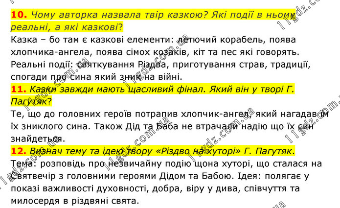 10. Чому авторка назвала твір казкою? Які події в ньому реальні, а які казкові? Казка – бо там є казкові елементи: летючий корабель, поява хлопчика-ангела, поява сімох козаків, кіт та пес які говорять. Реальні події: святкування Різдва, приготування страв, традиції, спогади про сина який зник на війні. 11. Казки завжди мають щасливий фінал. Який він у творі Г. Пагутяк? Те, що до головних героїв потрапив хлопчик-ангел, який нагадав їм їх зниклого сина. Також Дід та Баба не втрачали надію що їх син знайдеться. 12. Визнач тему та ідею твору «Різдво на хуторі» Г. Пагутяк. Тема: розповідь про незвичайну подію щона хуторі, що сталася на Святвечір з головними героями Дідом та Бабою. Ідея: полягає у показі важливості духовності, добра, віру у дива, співчуття та милосердя в різдвяні свята.