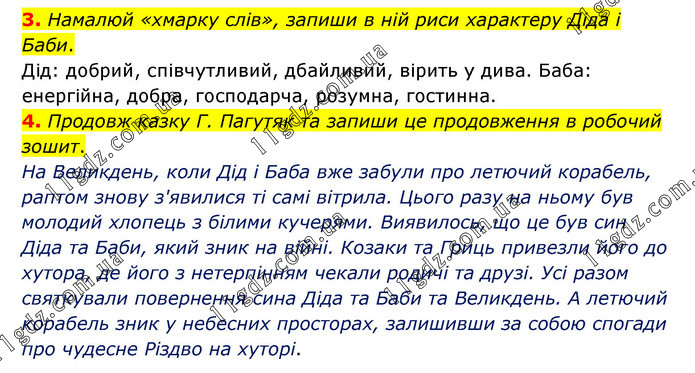 3. Намалюй «хмарку слів», запиши в ній риси характеру Діда і Баби. Дід: добрий, співчутливий, дбайливий, вірить у дива. Баба: енергійна, добра, господарча, розумна, гостинна. 4. Продовж казку Г. Пагутяк та запиши це продовження в робочий зошит. На Великдень, коли Дід і Баба вже забули про летючий корабель, раптом знову з'явилися ті самі вітрила. Цього разу на ньому був молодий хлопець з білими кучерями. Виявилось, що це був син Діда та Баби, який зник на війні. Козаки та Гриць привезли його до хутора, де його з нетерпінням чекали родичі та друзі. Усі разом святкували повернення сина Діда та Баби та Великдень. А летючий корабель зник у небесних просторах, залишивши за собою спогади про чудесне Різдво на хуторі.